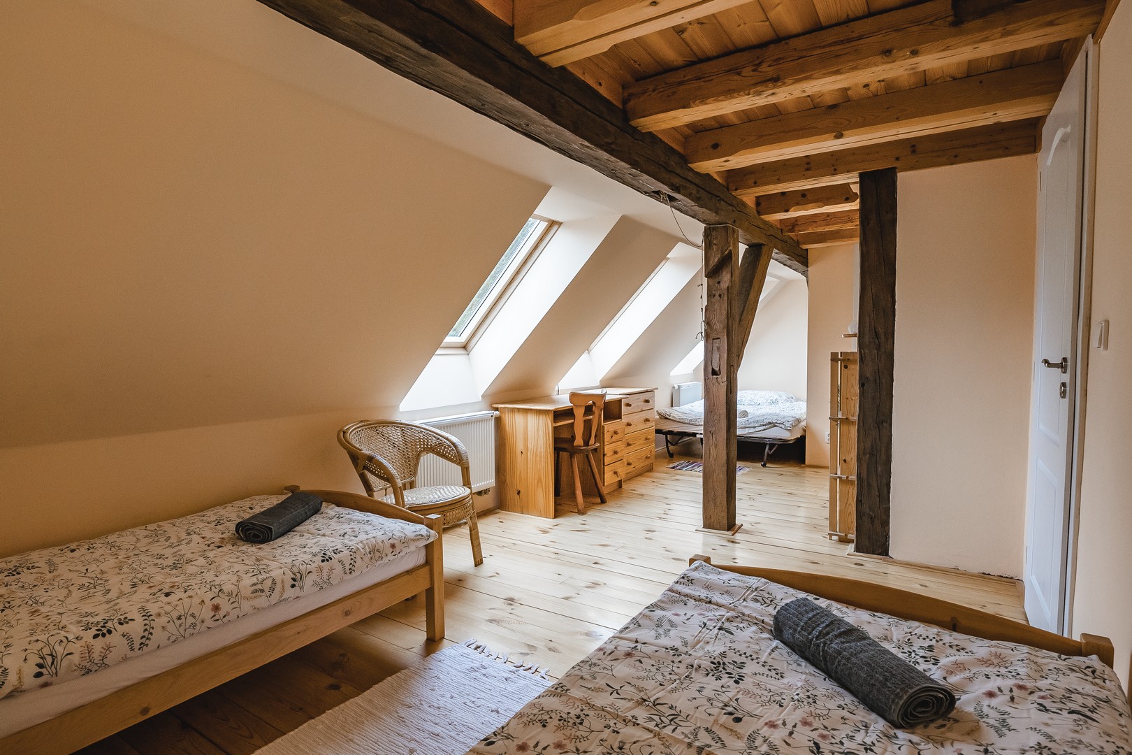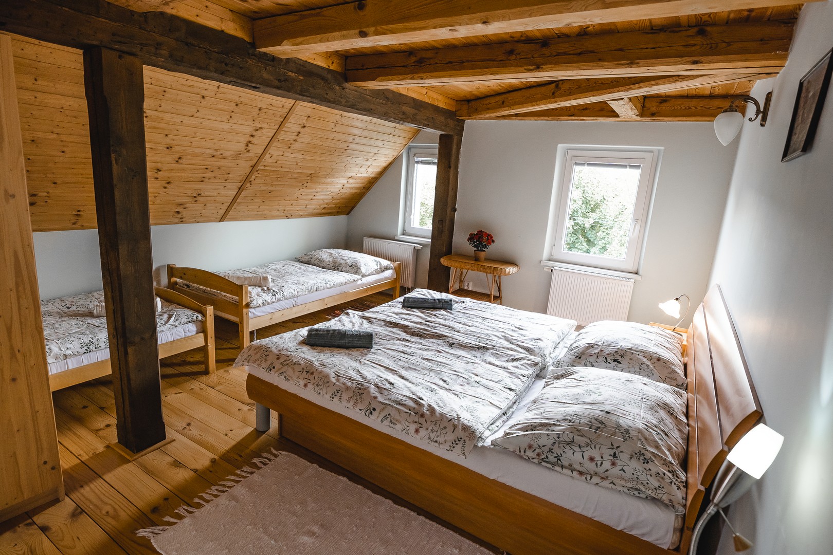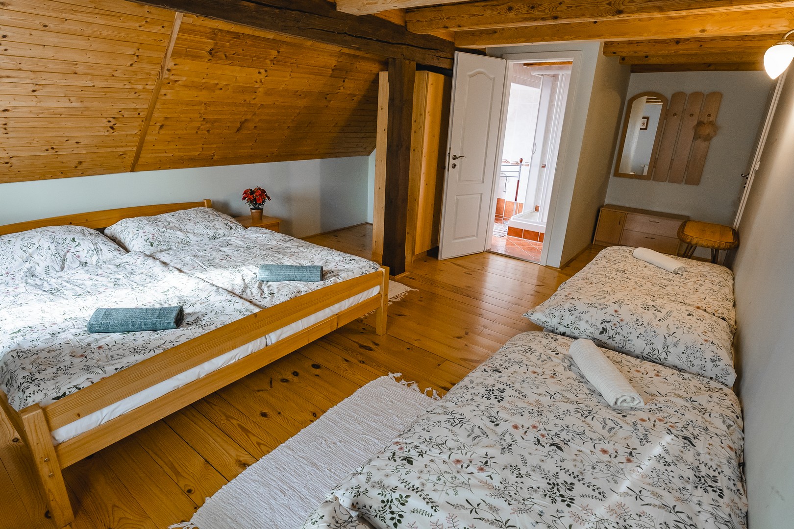 V prvním patře jsou tu pro vás připraveny čtyři útulné 2 - 4 lůžkové pokoje. Dva z nich jsou vybaveny každý svou samostatnou koupelnou se sprchovým koutem a toaletou, což vám poskytne větší soukromí. Pokud by jste raději sdíleli koupelnu s ostatními hosty, máme pro vás další dva pokoje se společnou koupelnou. Pokoje jsou vkusně zařízené s ohledem na komfort a estetiku.