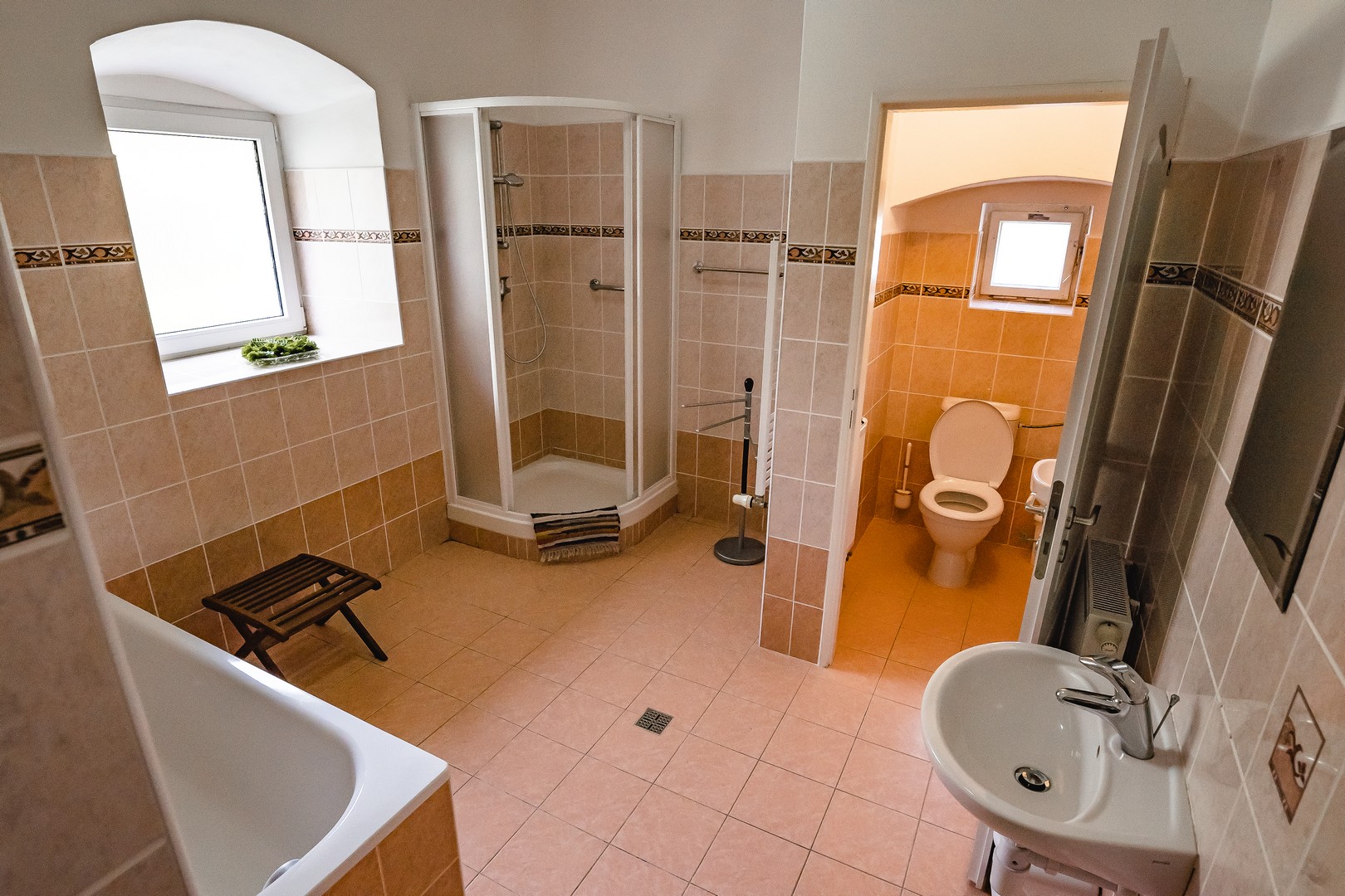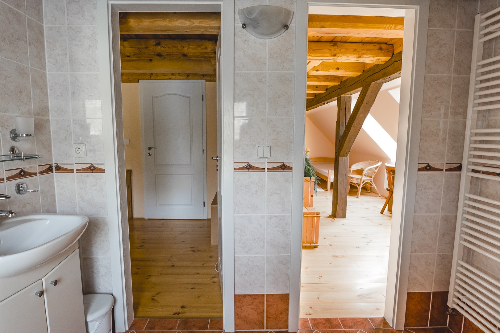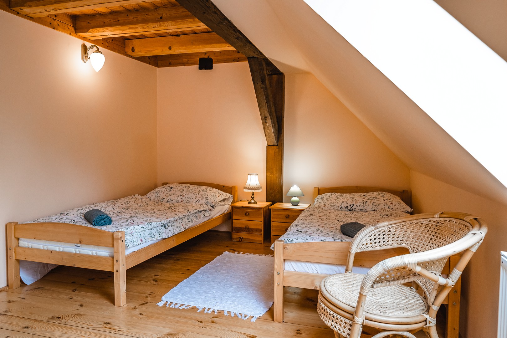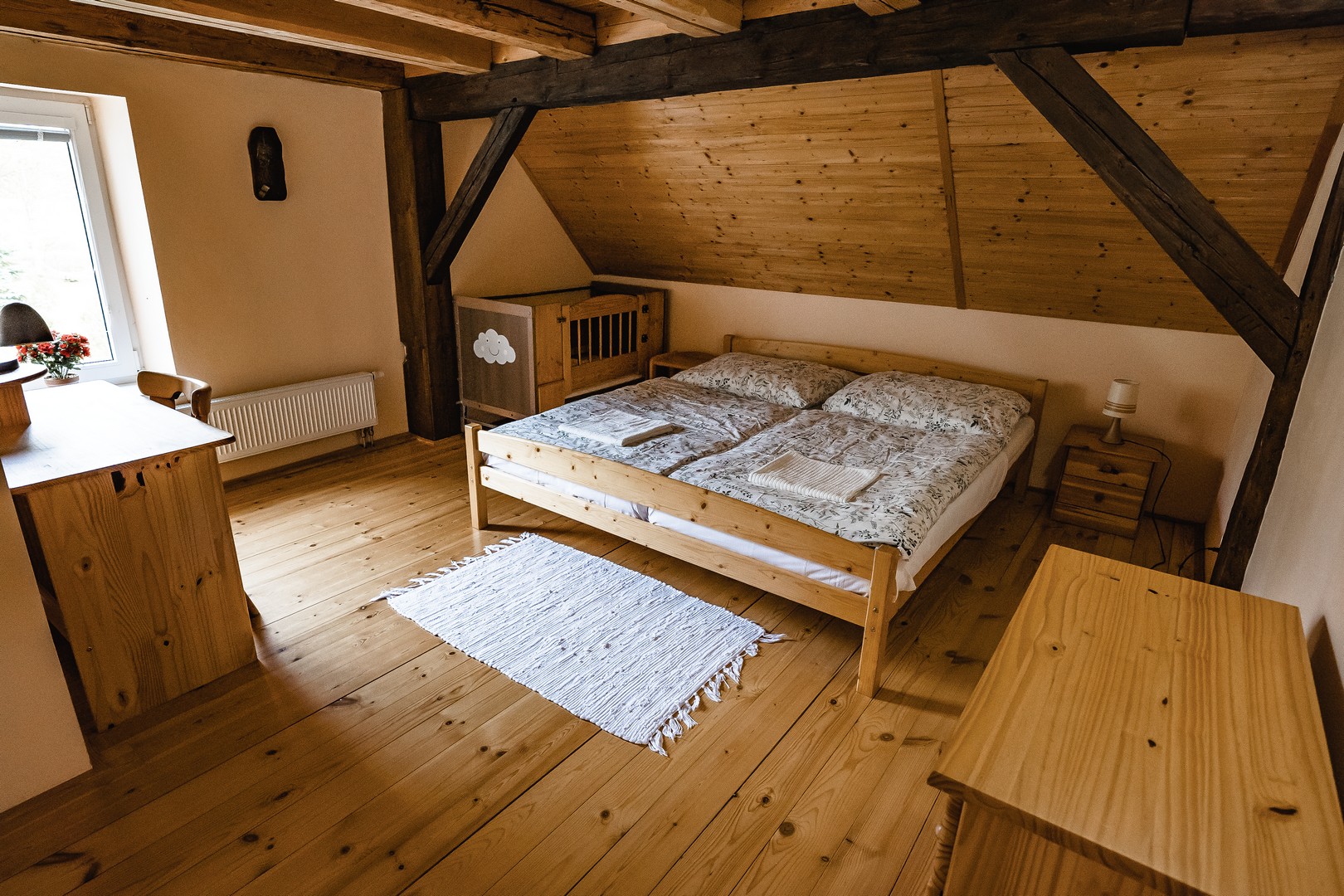 V prvním patře jsou tu pro vás připraveny čtyři útulné 2 - 4 lůžkové pokoje. Dva z nich jsou vybaveny každý svou samostatnou koupelnou se sprchovým koutem a toaletou, což vám poskytne větší soukromí. Pokud by jste raději sdíleli koupelnu s ostatními hosty, máme pro vás další dva pokoje se společnou koupelnou. Pokoje jsou vkusně zařízené s ohledem na komfort a estetiku.