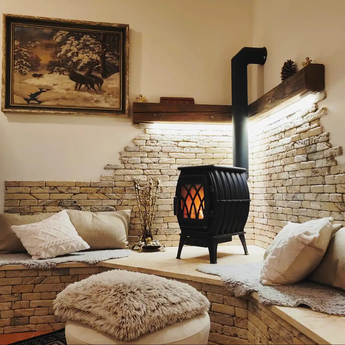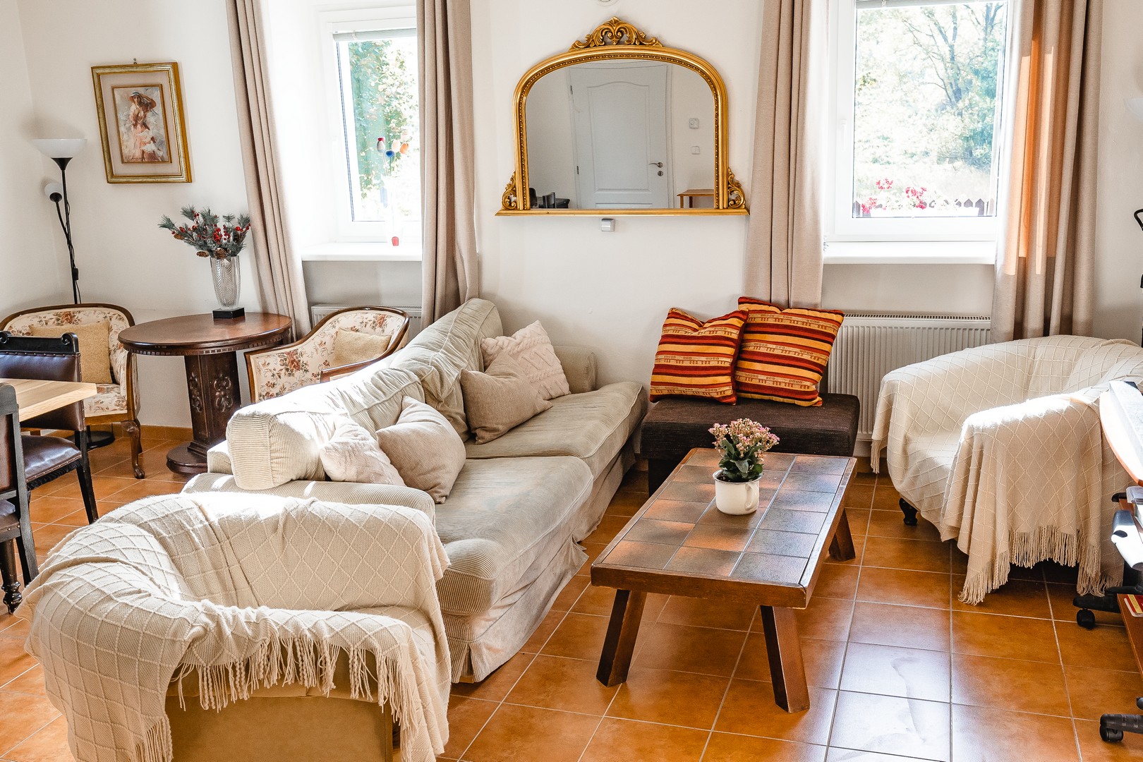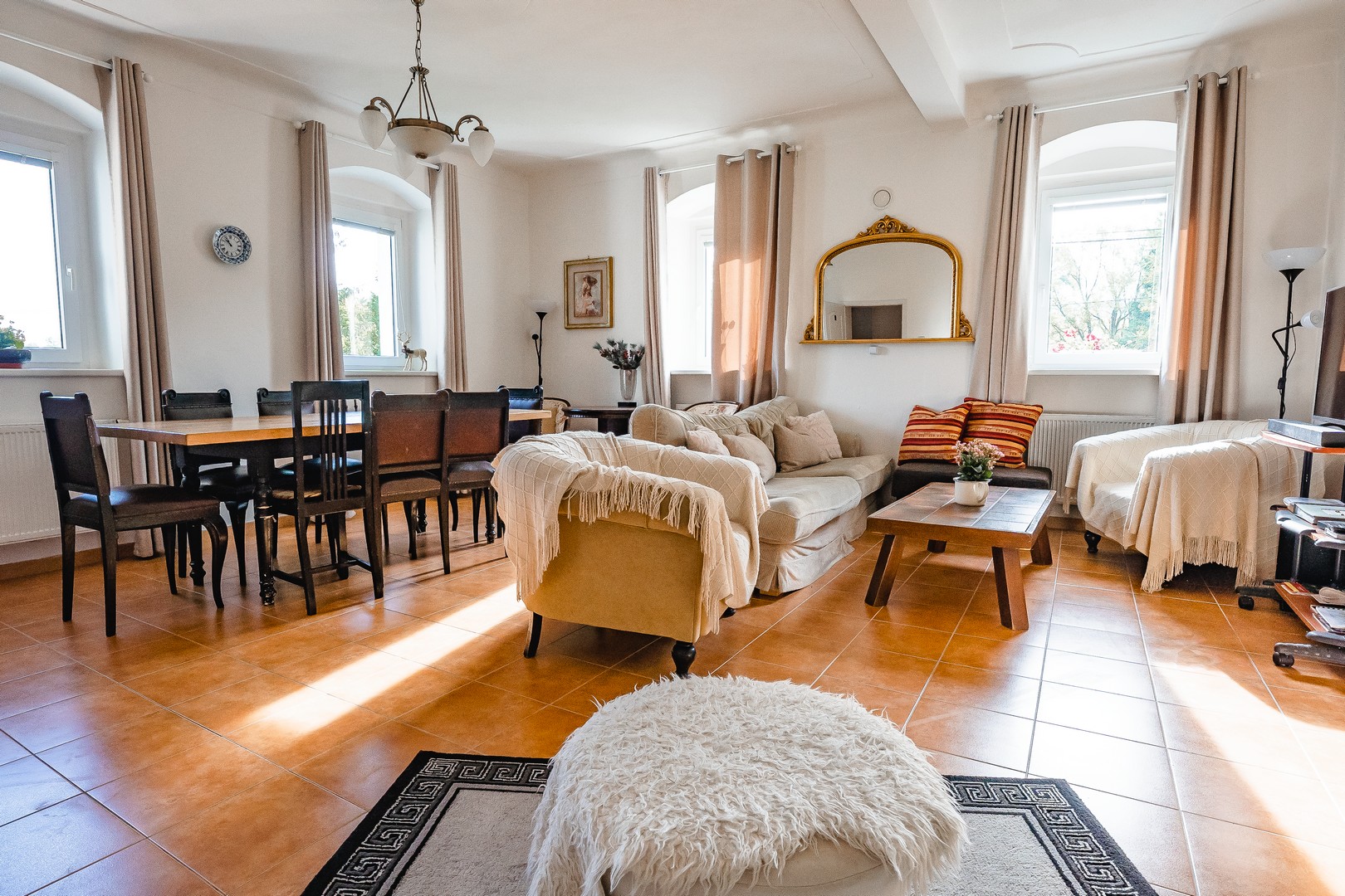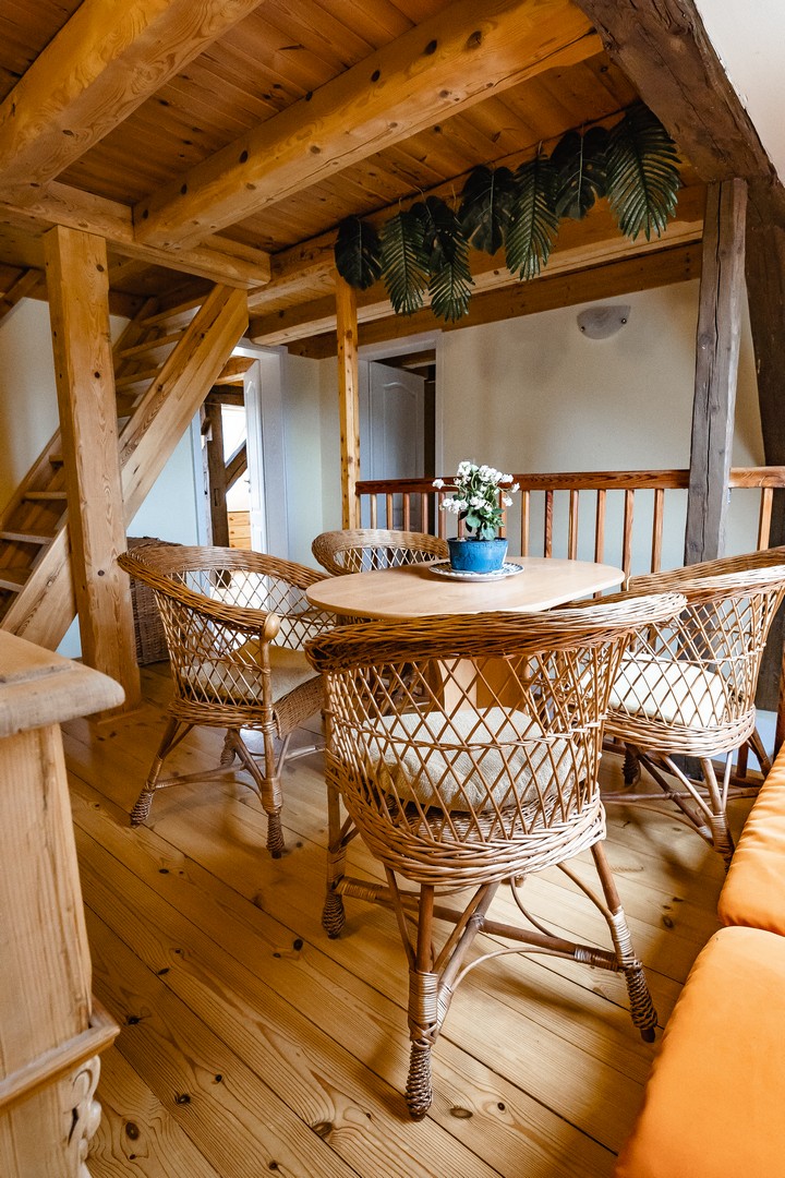 Naše útulná společenská místnost poskytuje ideální prostředí pro odpočinek a zábavu. Zde si můžete užít pohodlné posezení a sledovat oblíbené televizní programy a filmy na O2 TV. Krbová kamna vytváří příjemnou atmosféru a poskytují teplo, kde se můžete relaxovat a vytvořit si nezapomenutelné chvíle s rodinou a přáteli. Velký jídelní stůl představuje propojení a společenství, ať už pro rodinné oslavy, svátky nebo jednoduše pro každodenní rodinné jídlo.